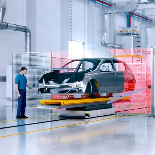 TÜV sertifikalı Safe Portal güvenlik sistemi, malzeme aktarma istasyonlarında verimli erişim denetimi için kullanılır. İki güvenli lazer alan tarayıcıdan ve Siemens S7 kontrolör için bir fonksiyon bloğundan oluşur ve EN ISO 13849'un gerekliliklerini yerine getirir. Dikey hizalanmış güvenli lazer alan tarayıcılar, akıllı koruma alanı değerlendirmesi ile PL d'ye kadar uygulamaları güvenilir ve kesintisiz şekilde korur. İnsan-Malzeme ayrımına yönelik diğer çözümlerle karşılaştırıldığında, insanların her durumda kesintisiz şekilde güvenliği sağlanır. Aynı anda, ön tanımlı konturlara sahip nesneler portaldan her an güvenli şekilde geçebilir. Bu, mümkün olan en yüksek verimlilikle çok esnek bir üretim prosesi elde edilmesine olanak sağlar.